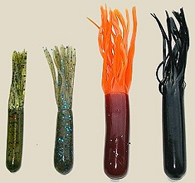 Tubes are rounded hollow soft plastic bodied bait open ended with a series of tentacles on the base. The main body is usually smooth but some have a ribbed exterior. The interior hollow design works well with holding liquid or paste scents. Tubes range in sizes from 1″-2″ for crappies and panfish 3″-6″ for largemouth and smallmouth bass up to 14″ for big pike and muskies. Most often tubes are rigged using a weighted tube jig placed within the tube’s body or to make a tube weedless anglers use a wide gap hook threading it through the nose and securing the hook into the body on the outer wall of the tube. Upon casting a tube it will display a spiral action on the fall with the tentacles undulating providing a injured baitfish look, in jigging the tube off the bottom it will appear as a crawfish imitation especially good for feeding smallmouth bass. Tubes can be rigged as bait using a Texas Rig, Carolina Rig, or on a drop shot rig. |