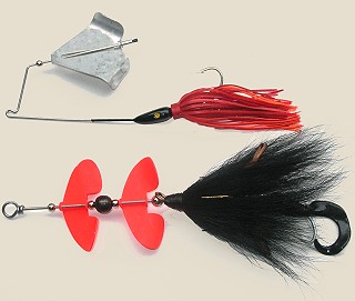 Buzzbaits resemble either a standard spinnerbait or inline spinner with the exception of a rotating propeller blade replacing a flat blade. Buzzbaits are a topwater spinner and must be retrieved rapidly to produce a loud clacking sound as they move across the surface. Excellent lure for bass and pike.